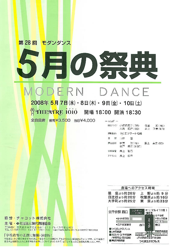 社団法人現代舞踊協会が主催する、第28回モダンダンス「5月の祭典」に当舞踊団(井上圭子、青木愛子、谷淑江、丹羽暁子、秦史乃、北山由佳、田尻希絵、渡邉美穂、団野美歌、玉沖朋子)が出演、「ラ・ビダ・ブレベ」を踊ります。